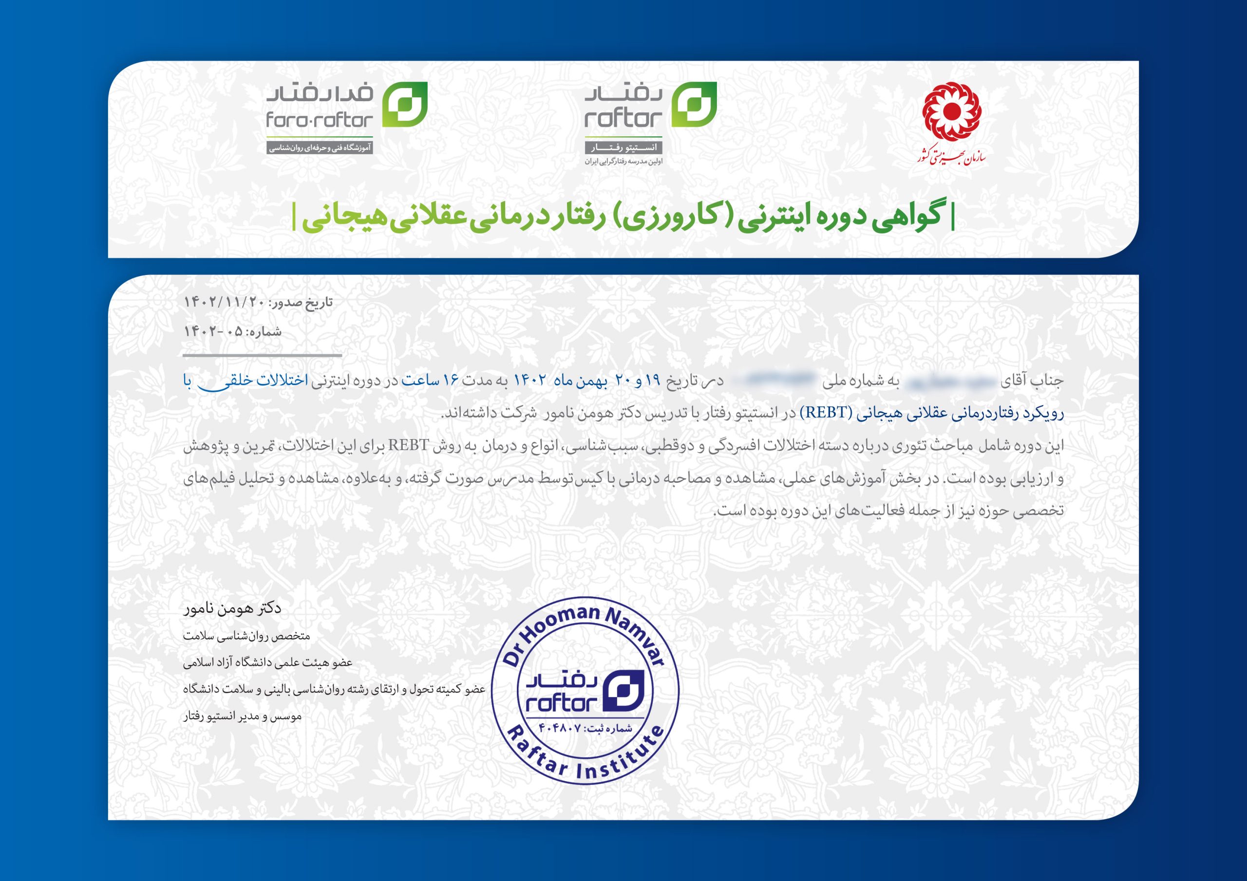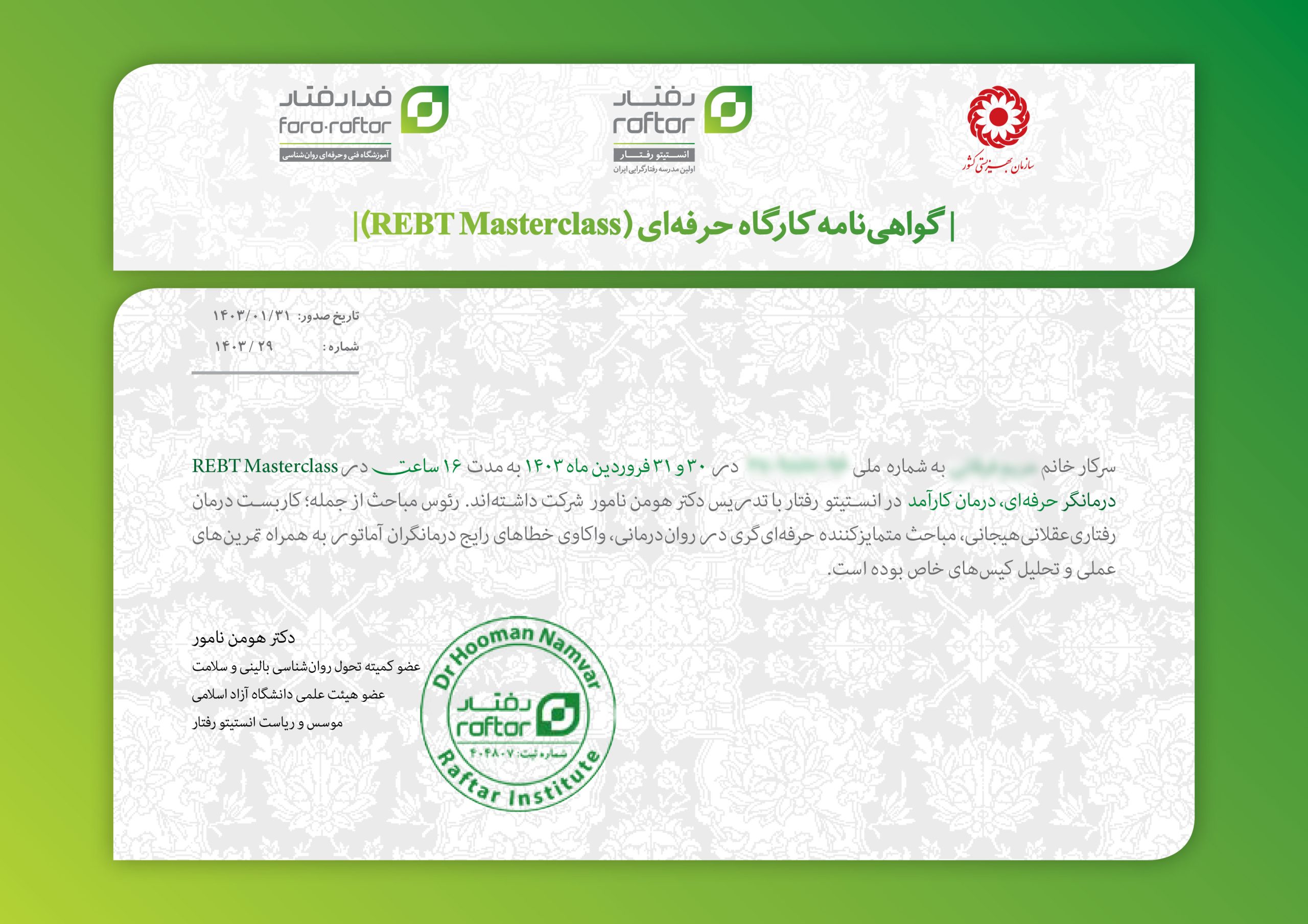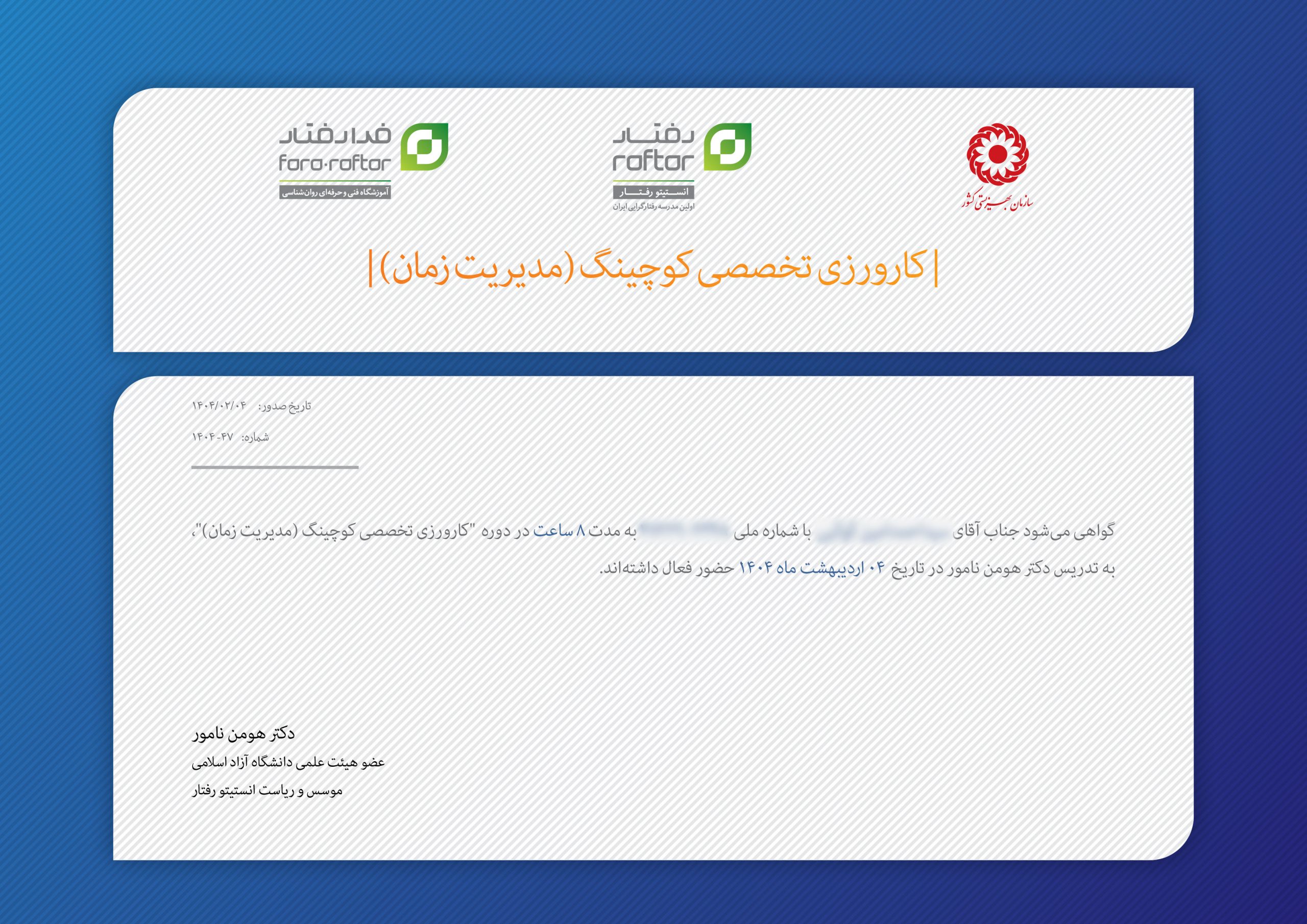 یکی از ویژگیهای برجسته کلاس های روانشناسی رفتار، ارائه دوره های روانشناسی با مدرک معتبر است که از سازمان فنی و حرفهای کشور صادر میشود و به عنوان تنها مدرک رسمی و قابل ترجمه در ایران شناخته میشود. این مدرک، علاوه بر اعتبار علمی و حرفهای، قابلیت ارائه در محیطهای آموزشی، کاری و بینالمللی را دارد و مسیر ارتقای حرفهای شرکتکنندگان را هموار میکند.