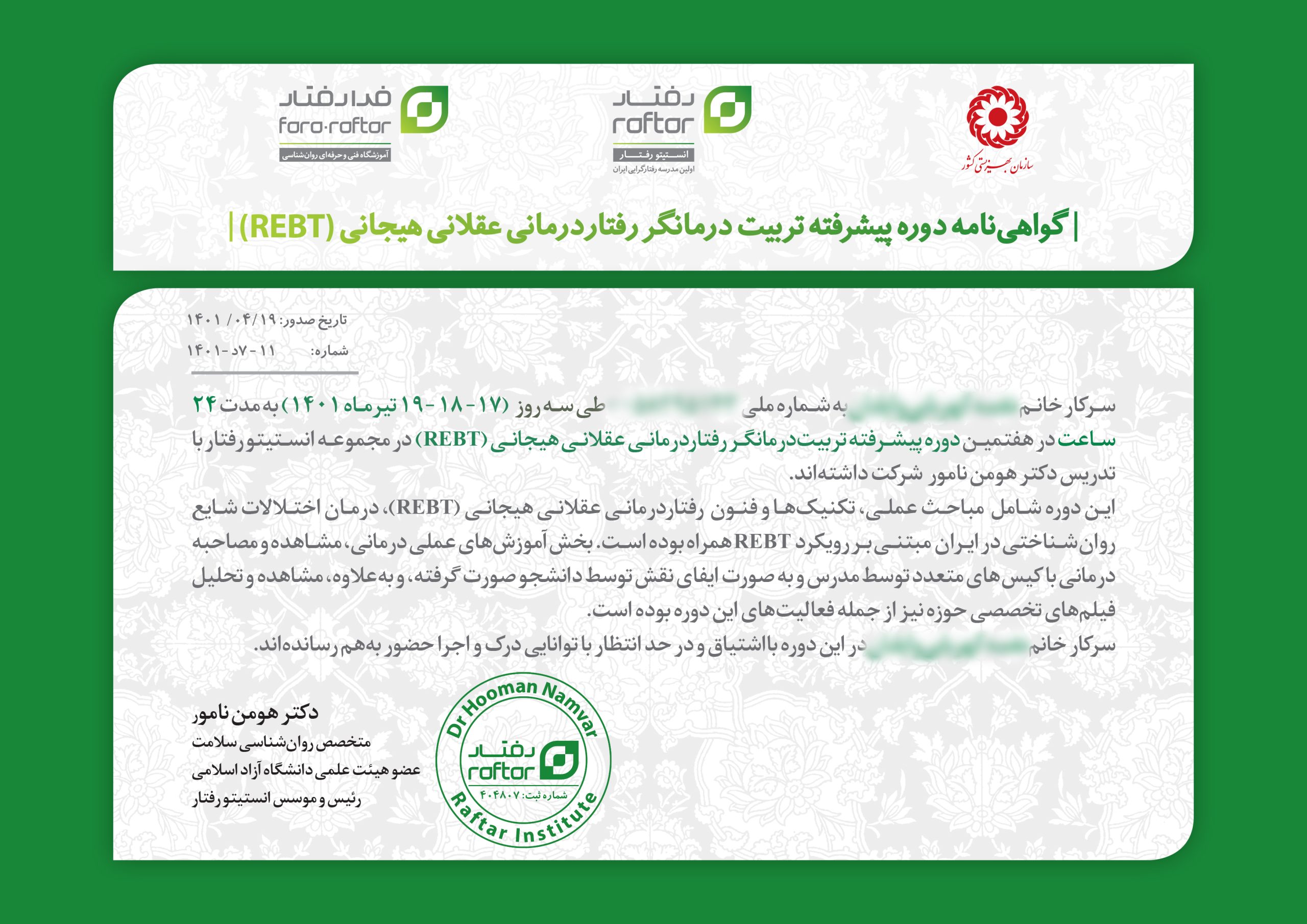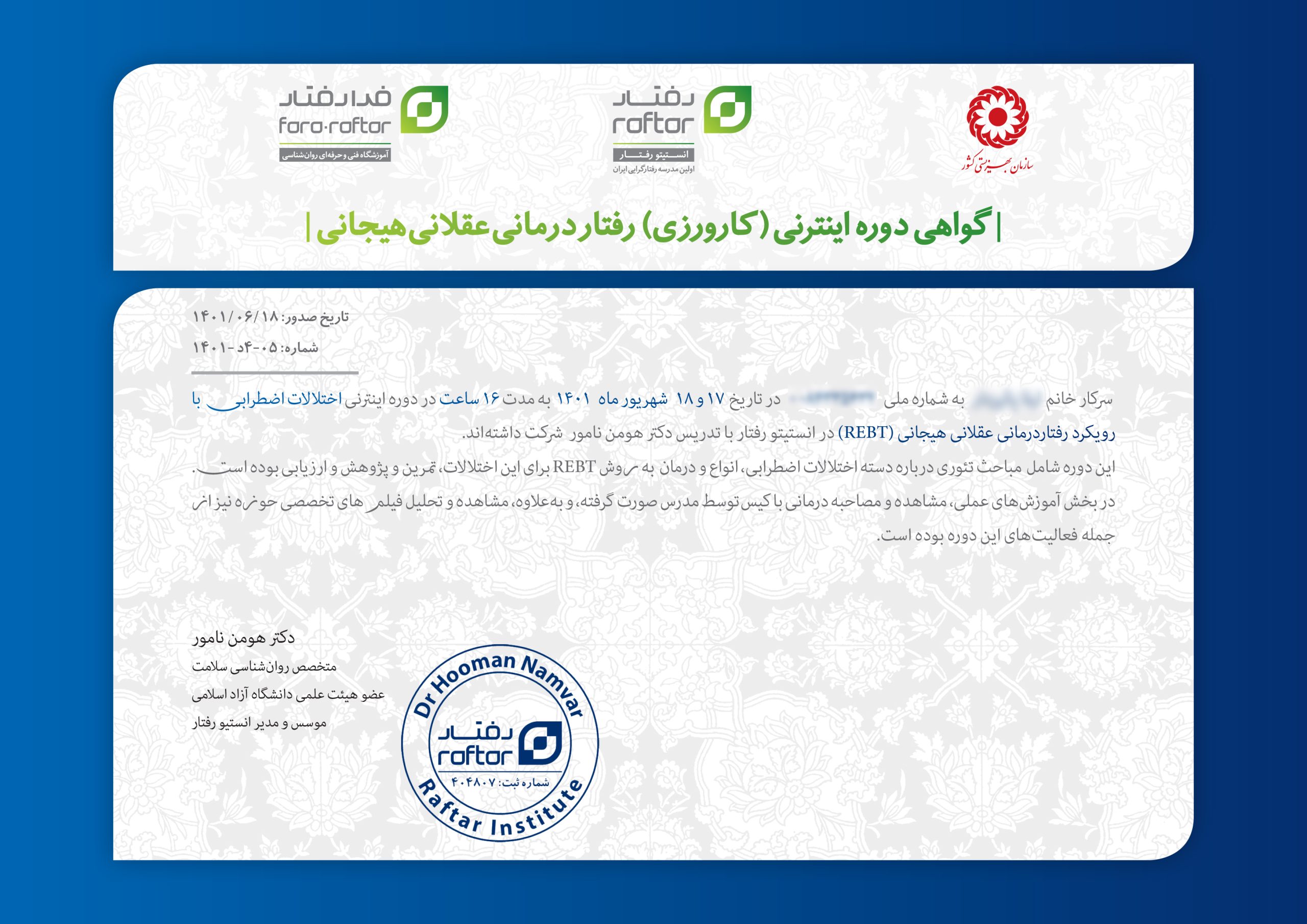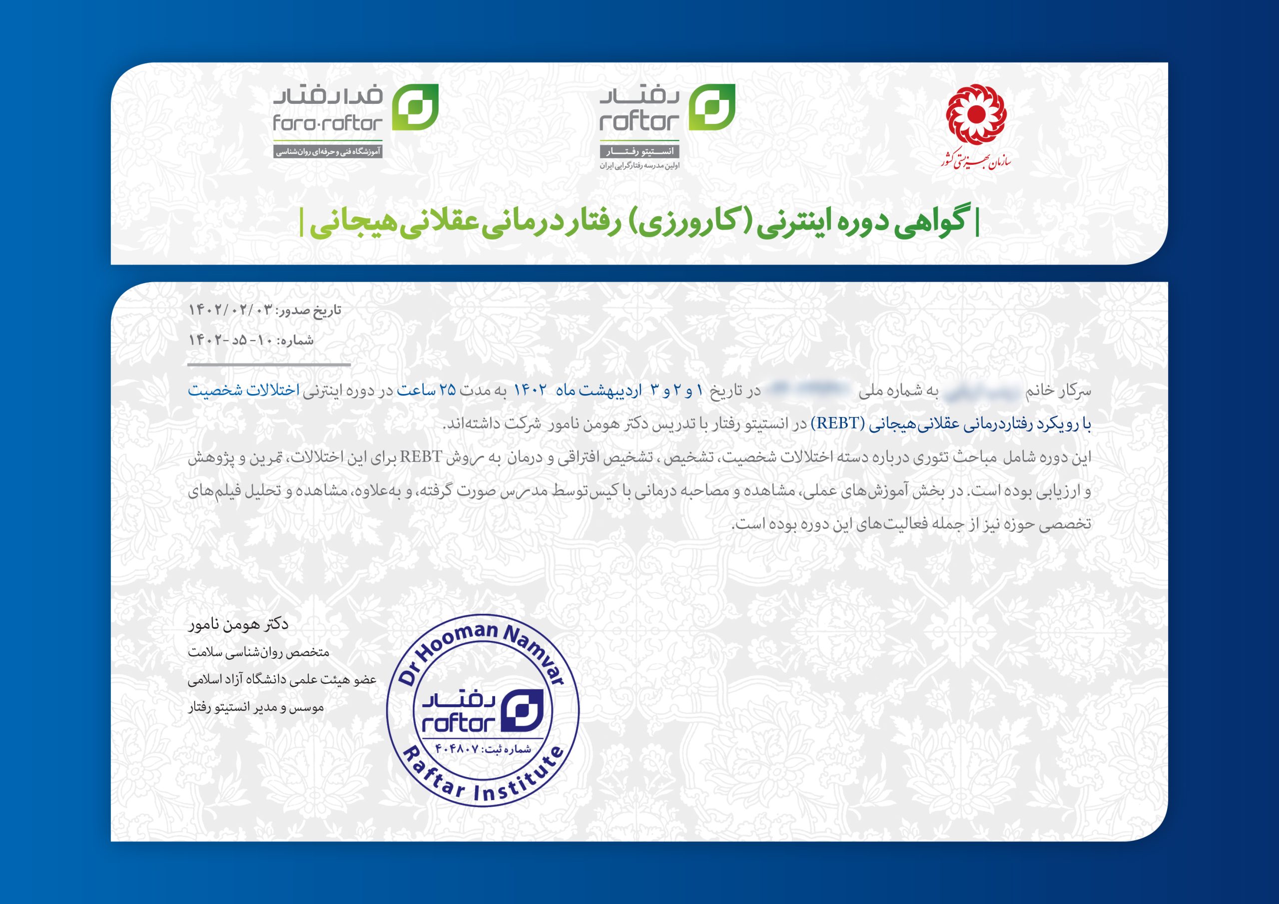 یکی از ویژگیهای برجسته کلاس های روانشناسی رفتار، ارائه دوره های روانشناسی با مدرک معتبر است که از سازمان فنی و حرفهای کشور صادر میشود و به عنوان تنها مدرک رسمی و قابل ترجمه در ایران شناخته میشود. این مدرک، علاوه بر اعتبار علمی و حرفهای، قابلیت ارائه در محیطهای آموزشی، کاری و بینالمللی را دارد و مسیر ارتقای حرفهای شرکتکنندگان را هموار میکند.